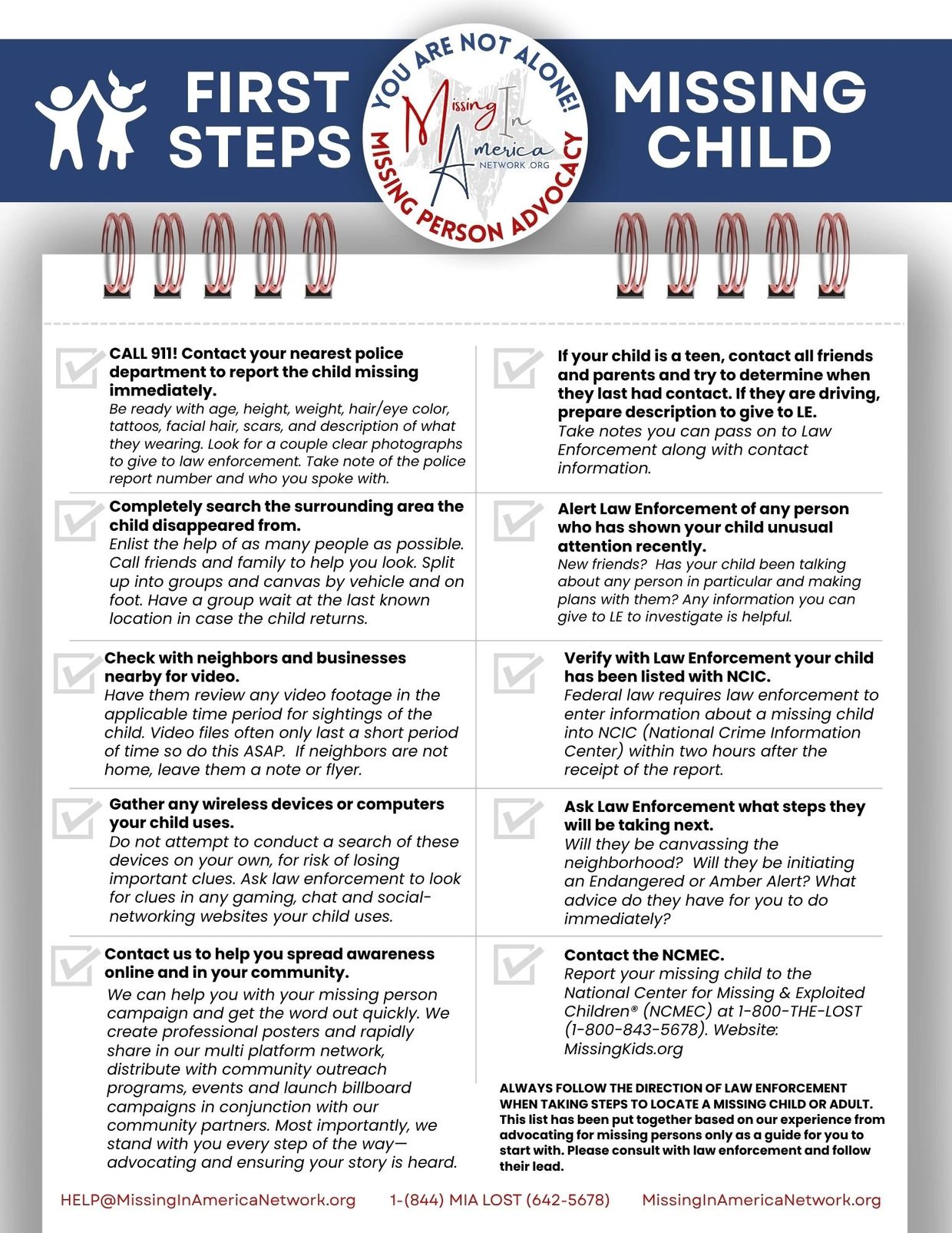 When a child goes missing, every second counts—and it’s easy to feel overwhelmed. That’s why we created this First Steps Checklist to guide you through the critical actions to take immediately. This list is just the beginning of the journey to bring your child home. It’s designed to help you stay focused, informed, and proactive during the most difficult moments.
